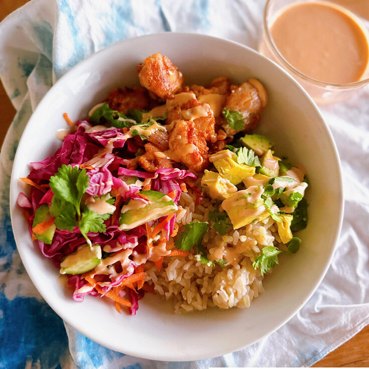 These chicken bowls are a fresh, flavorful twist on a takeout favorite. Chicken cubes are minimally seasoned and tossed in the air fryer until golden and juicy, then served on a bed of brown rice and mixed with colorful, crunchy and creamy toppings. A drizzle of a better-for-you-homemade bang bang sauce ties it all together with a spicy-sweet kick. A healthier make-ahead lunch to brighten a work week or a fun weekend family meal!