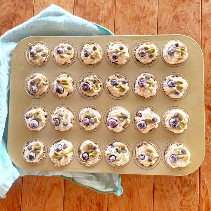 Add in frozen blueberries (no need to thaw), pumpkin seeds and dark chocolate chips. Stir until just combined. Mixture will be thick.