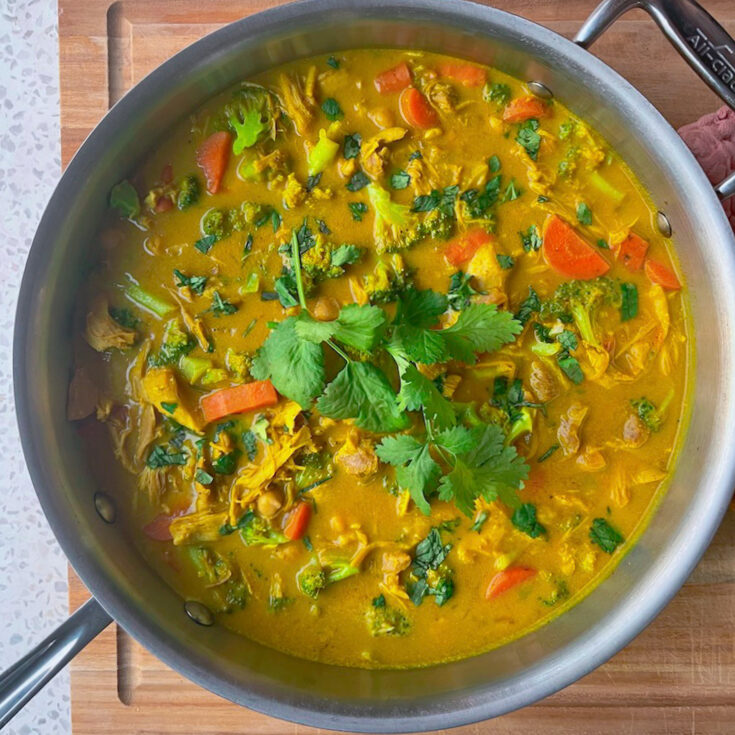 This nutritious and delicious dinner features chicken, carrots, broccoli, onion and fiber-rich garbanzo beans in a yummy, comforting curry sauce made with dried spices found in many pantries. Pro tip: Broccoli stalks are just as nutrient-dense as florets, so chop and toss them into your pot to soak up the flavors. For an easy one-pot meal, use rotisserie chicken!