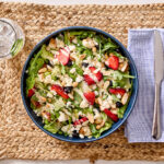 In a large serving bowl, combine the romaine, chicken, strawberries, blueberries, chickpeas, feta and almonds. Serve with the vinaigrette on the side or add it to the salad just before serving.